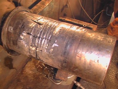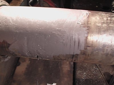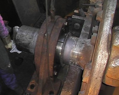 Wał o wadze ok. 15 Mg nie był demontowany. Czop dokładnie oczyszczono szlifierką i odtłuszczono. Następnie kompozytem CHESTER METAL SUPER uzupełniono ubytki minimalnie ponad średnicę nominalną wału. W czasie wiązania warstwa Chester Metal Super była przez kilka godzin wygrzewana w strumieniu gorącego powietrza. Z uwagi na brak możliwości przetoczenia, nadmiar kompozytu został usunięty papierem ściernym. Do odwzorowania kształtu walca użyto przykładnicy podpieranej w nieuszkodzonych punktach wału.