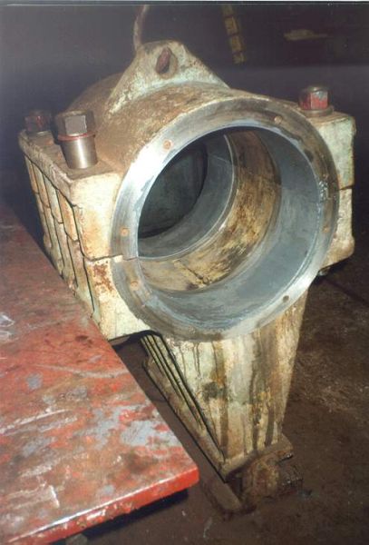 Gniazda łożyskowe korbowodu mimośrodkowej kruszarki kamienia typu R -40/15 produkcji „MAKRUM” Bydgoszcz, uległy wybiciu. Luz do 2 mm przy średnicy nom. 440 mm.